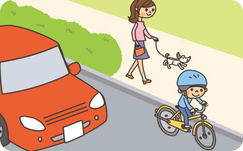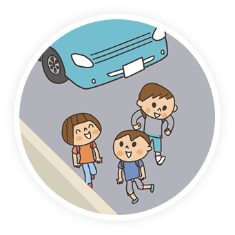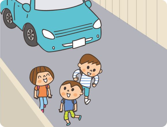 歩道のない道路を友達と遊びながら歩くと、車が接近しても気づきにくく、車の前にふくらんだりするなど大変危険です。縦一列になって道路の右側を歩くように指導しましょう。