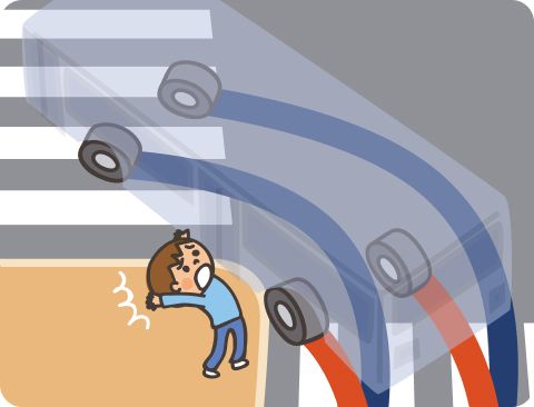 バスやトラックなどの大型車が曲がるとき、後ろのタイヤは前のタイヤよりも内側を通るため、内輪差が生じます。そのため、車道に近いところで待つと左折する大型車に巻き込まれる危険があります。十分に安全なところまで離れて待つように教えましょう。