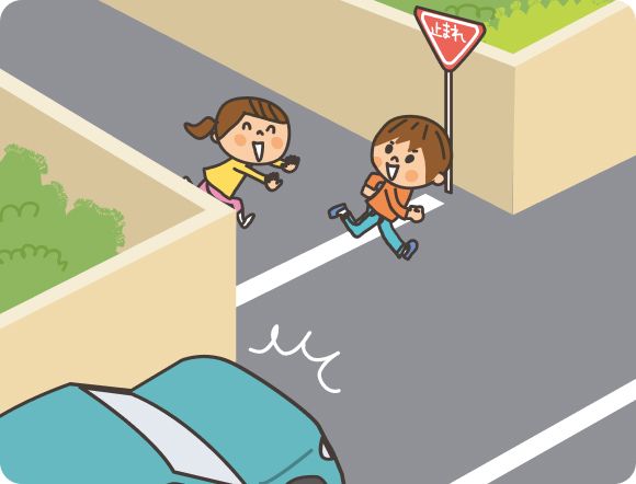 見通しの悪い交差点や信号のない横断歩道などの危険な場所では「止まる」「見る」「確かめる」を守ること、道路や車の出入りのある場所で絶対に遊ばないことを徹底させ、お子さまが油断しがちな場所でも危険な行動をとらないように繰り返し指導しましょう。