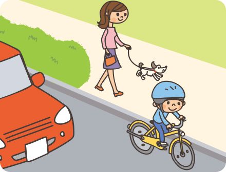 通学路や自宅周辺の生活道路にもさまざまな危険が潜んでおり、ふだん何となくしている行動によって事故にあってしまうこともあります。お子さまといっしょにご自宅周辺を歩いて、どんなところに危険があるかを話し合い、危険な行為を絶対にしないように指導しましょう。