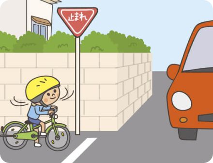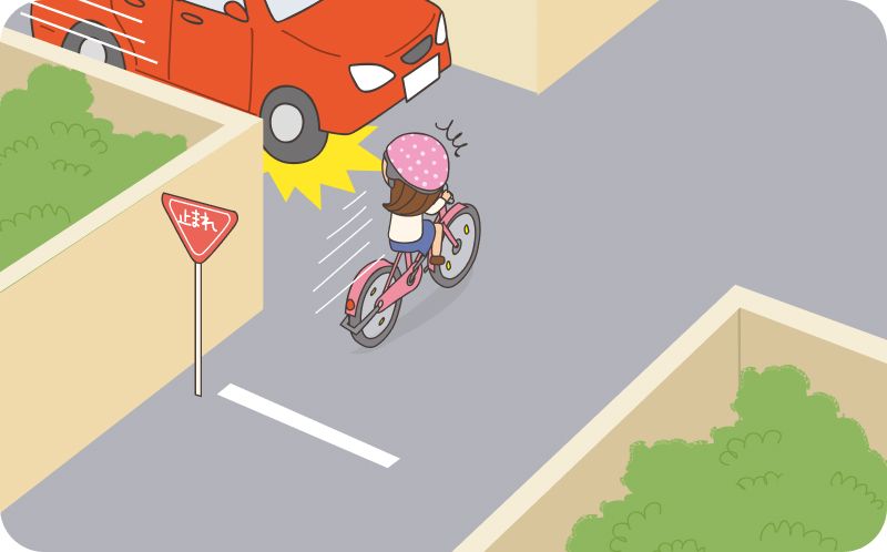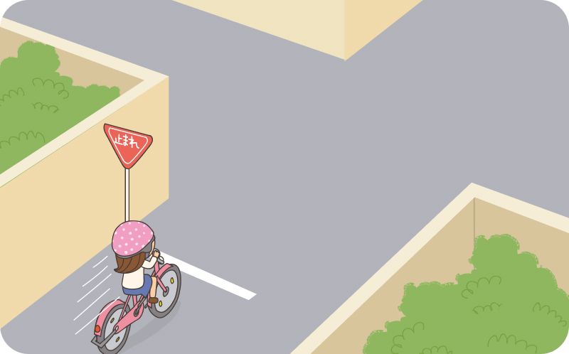 見通しの悪い交差点ではドライバーからもお子さまの姿を発見しにくく、大変危険です。交差点ではいったん止まり、道路標識を意識させ、右左の安全を確認するよう習慣づけましょう。