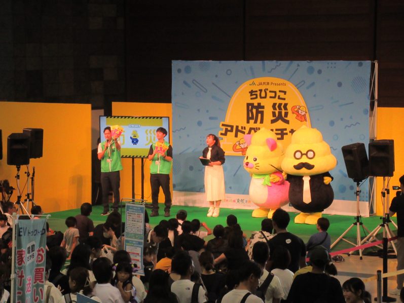 また「うんこ先生の防災ショー」や「うんこ防災ドリル」を配布。子どもたちの興味を引くモチーフとユーモアで「防災」を学んでいただくとともに、「ザブトン教授の防災教室」でイス型の地震体験装置によるリアルな揺れを体験していただきました。体験者からは、「起震車は体験したことはあるが、このように椅子に座った形で体験できたのは良かった。思った以上に揺れて、今も足が震えている」との感想をいただきました。
