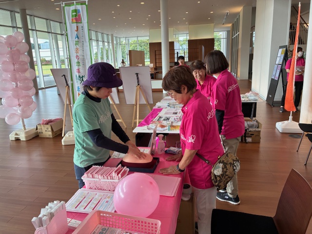 JA共済連鳥取は、乳がんに対する理解を深めてもらい、県内の乳がん検診の受診率を上げるため、ピンクリボン運動月間にあわせて、県内3会場で乳がん啓発イベントを開催しました。会場では、パネル展示・触診モデル体験・チラシ配布などで乳がんに対する理解を深めてもらい、予防・早期発見・早期治療の大切さを伝えました。